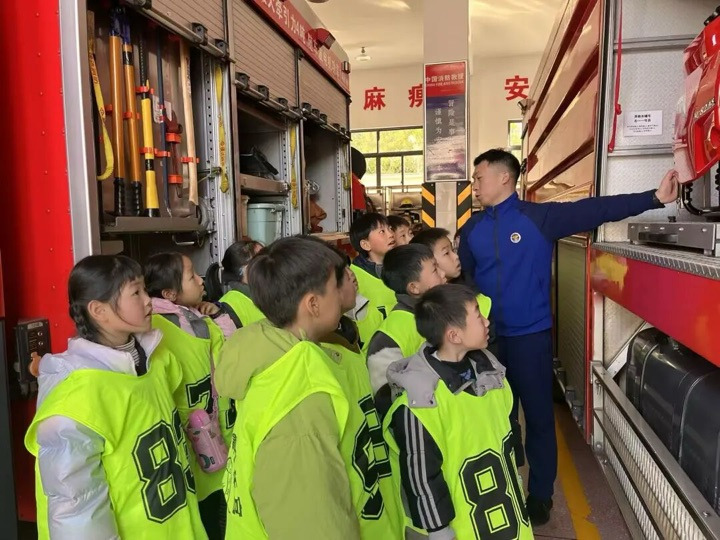活动开始,消防救援人员给孩子们播放了消防安全宣传片。宣传片用生动的画面和真实的案例,展示了火灾的危害性、预防措施以及火场逃生技巧,为接下来的活动打下了良好的基础。消防救援人员还用通俗易懂的语言介绍了消防站的日常职能与消防安全的重要性,瞬间拉近了与孩子们的距离。在消防装备展示区,消防救援人员化身“科普讲解员”,逐一展示消防服、头盔、灭火器、救援绳索等专业装备,详细讲解其用途和穿戴技巧。孩子们听得津津有味,并在消防救援人员的指导下试穿消防服,亲身感受装备的重量与功能,真切体会到消防救援人员工作的不易。