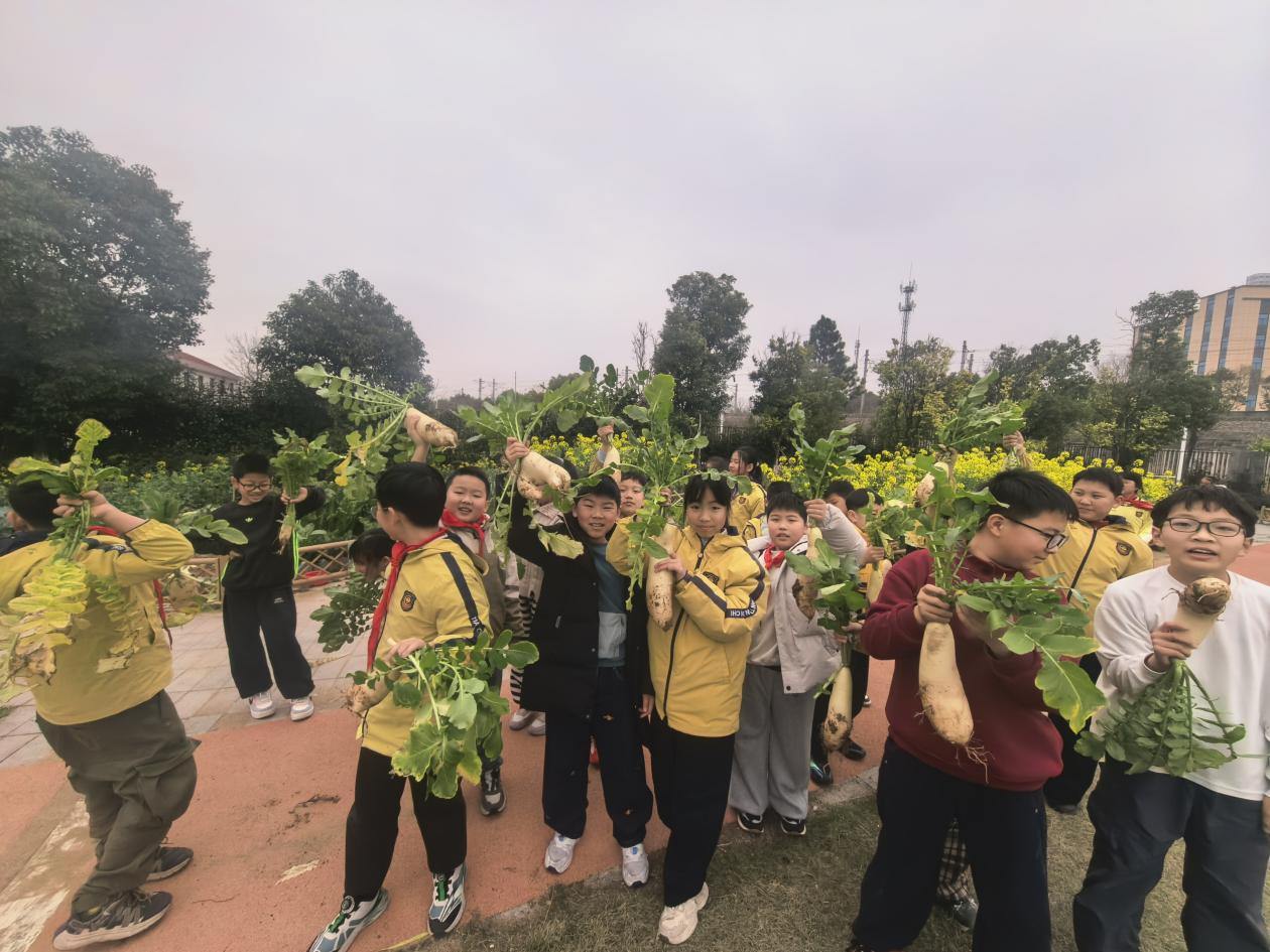 “从去年11月份播下种子,到如今看着油菜花盛开、白萝卜成熟,我每天都来基地看看,浇水、松土、除草,每一步都不敢马虎。”五(5)班的范同学捧着亲手拔出的白萝卜,脸上洋溢着丰收的喜悦,“今晚我要给父母做一道菜。”