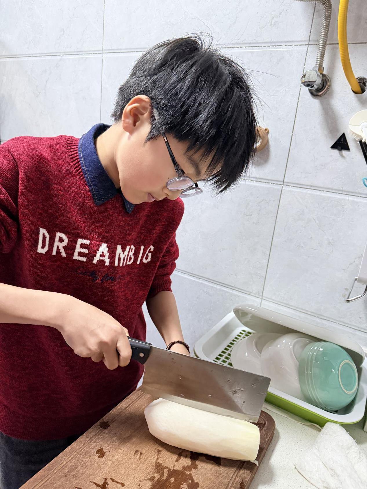 回到家,孩子们纷纷化身“小小美食家”,开启了一场萝卜美食创作之旅。有的跟着家长学习清洗、切块,将白萝卜做成清爽可口的泡菜萝卜;有的尝试炖煮萝卜汤,看着白萝卜在锅中慢慢变得软糯鲜香;还有的发挥创意,把萝卜切成可爱的造型,搭配其他食材做成营养丰富的拼盘。大家一边动手制作,一边和家人分享田间劳动的趣事,将劳动的收获转化为舌尖上的美味,也让“劳动创造幸福”的种子在心中深深扎根。