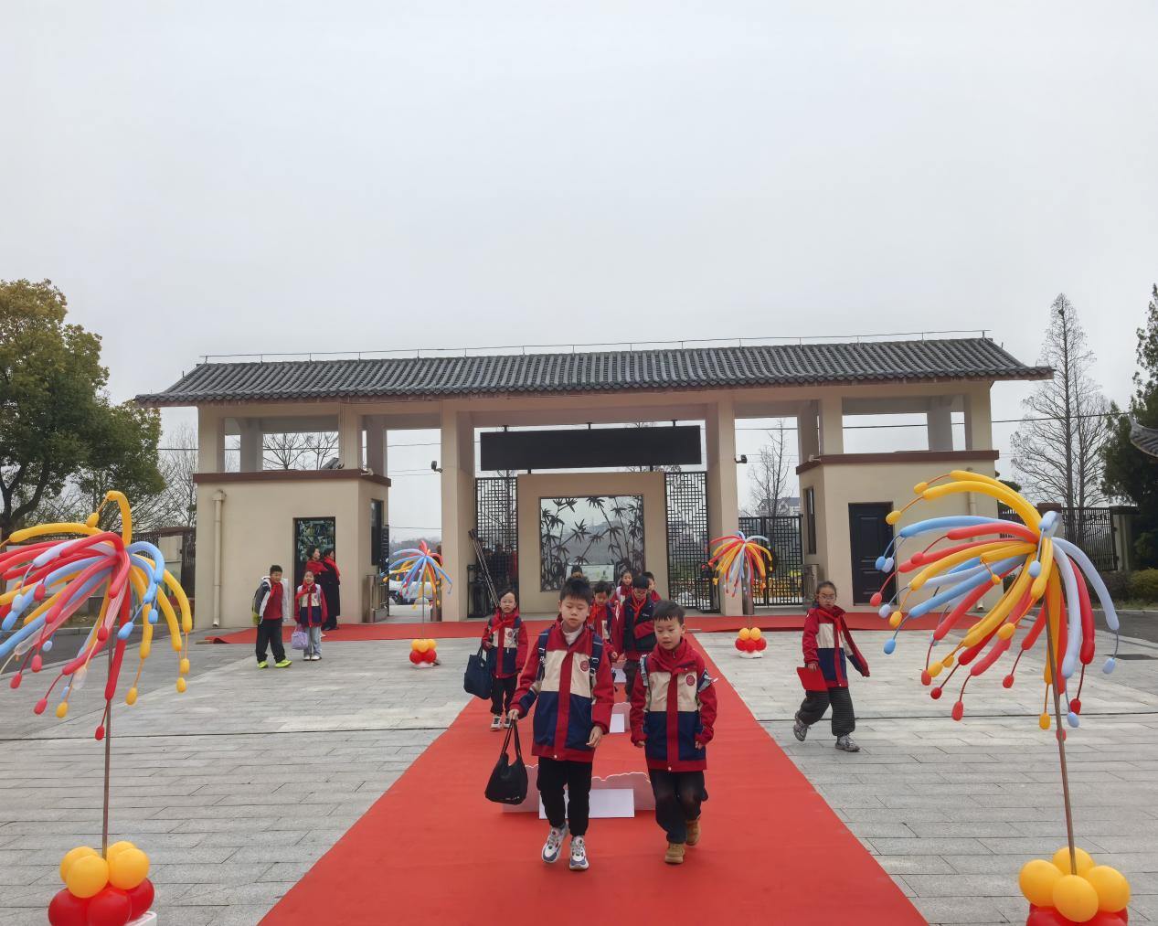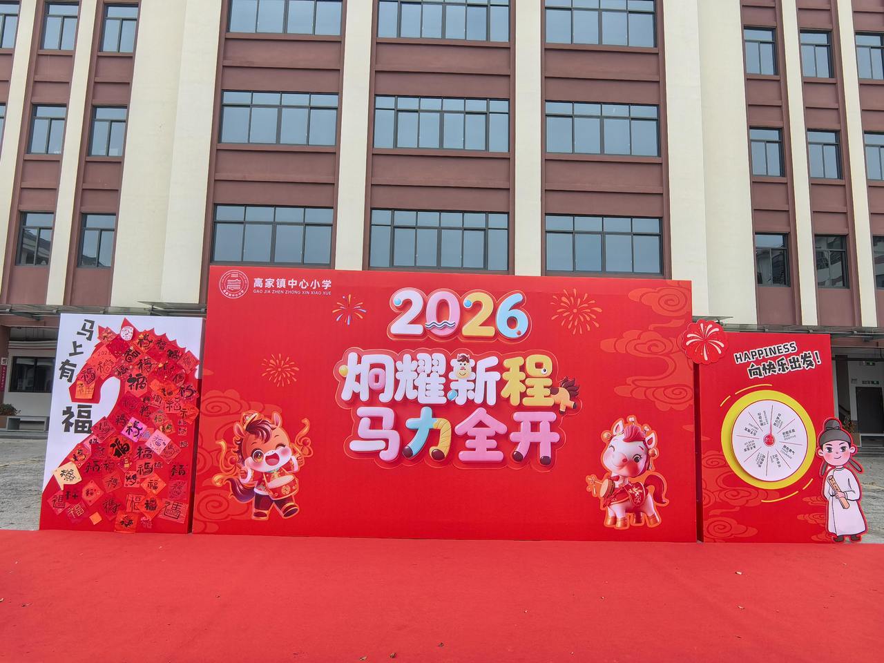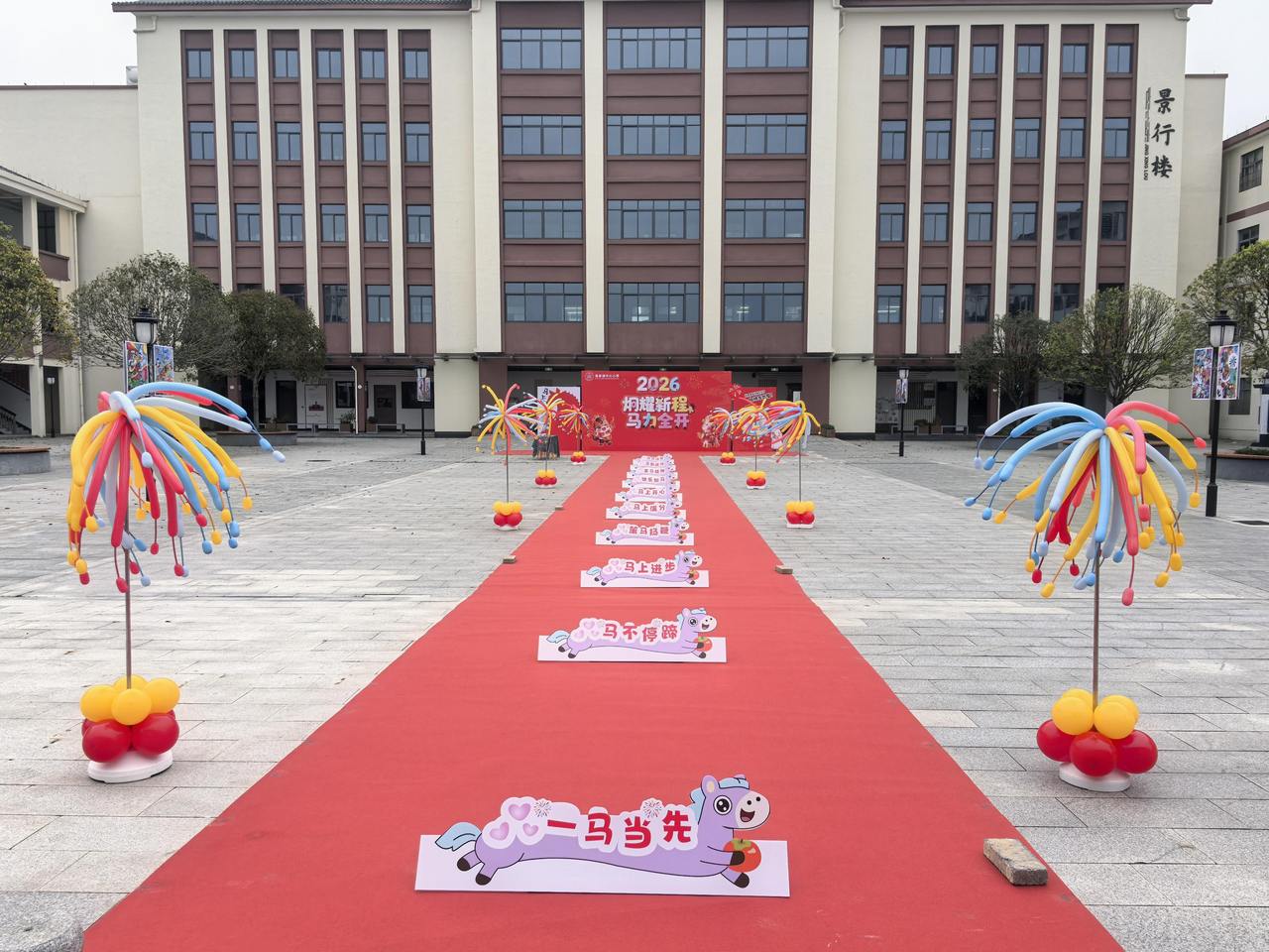 清晨的校门口春风拂面,一条红毯铺就的“祝福大道”格外引人注目。道路两侧,一幅幅与“马”有关的祝福语映入眼帘——“马上有福”、“一马当先”、“马到成功”、“龙马精神”……这些饱含着殷切期望与美好寓意的成语,仿佛化作了一个个跃动的音符,奏响了新学期的序曲。孩子们身姿挺拔,踏着红毯,依次穿过这些祝福语,每一步都走得格外坚定,仿佛要将这些美好的寓意深深印刻在心中,预示着在新的一年里,他们将带着这股“马”力全开的劲头,在学习与成长的道路上一往无前。