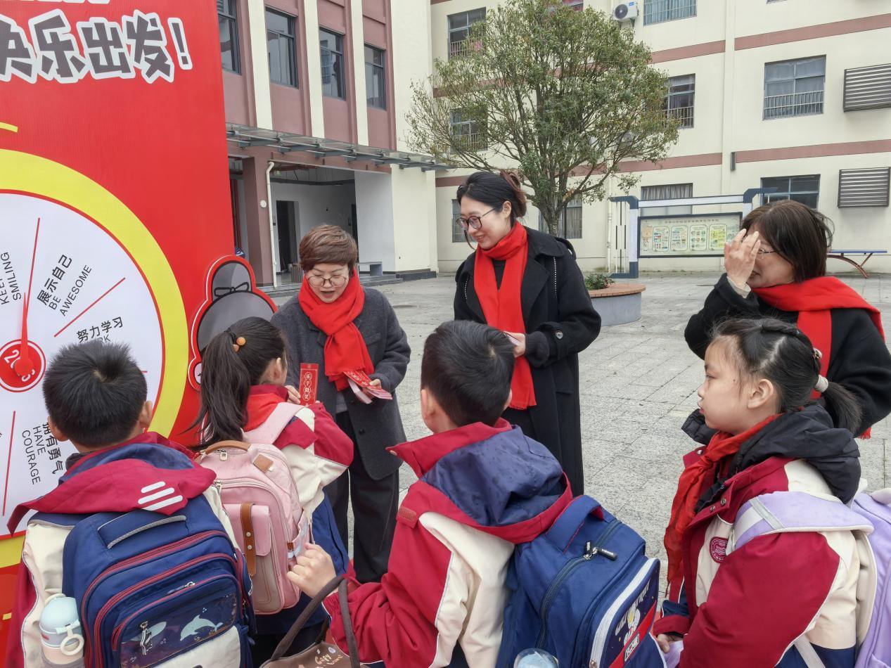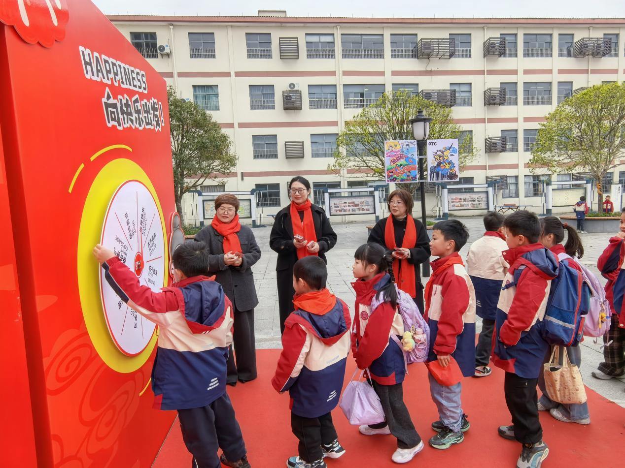 踏过“祝福大道”,一个五彩斑斓的大转盘瞬间攫住了孩子们的目光。这是学校匠心打造的“福气转转转”活动。转盘上,“展示自己”“积极乐观”“选择快乐”“拥有勇气”等汉字熠熠生辉,它们代表着学校的育人目标。孩子们满心期待地拨动转盘,指针飞速旋转,最终稳稳停在某个字上。紧接着,他们从老师手中接过一枚对应书签。这书签可不简单,它满载着学校对学子德智体美劳全面发展的深切期许,将成为新学期阅读路上的贴心伙伴。