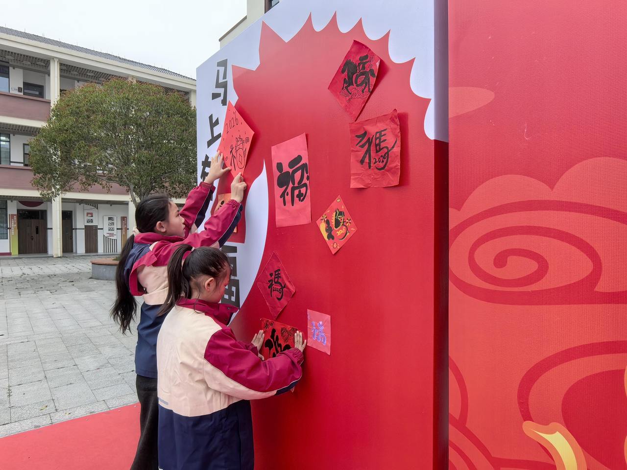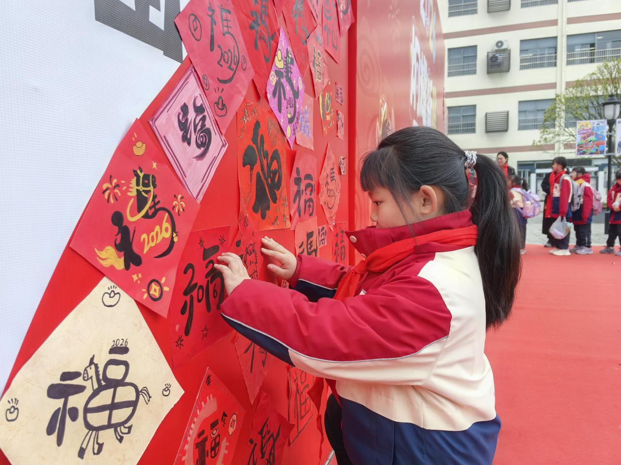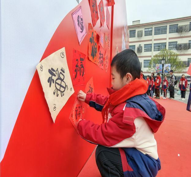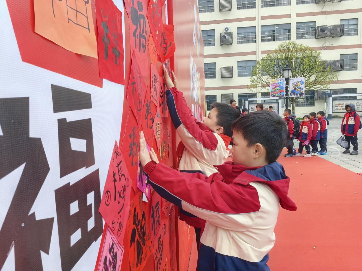 最令人动容的,莫过于“百福纳吉”环节。寒假期间,孩子们就用心练习,亲手书写了一个个形态各异、饱含心意的“福”字。此刻,他们小心翼翼地将自己在家中写就的“福”字拿出来,郑重地贴在校内一面巨大的骏马图案展板上。红纸黑字,翰墨飘香,一个个“福”字如同片片绚丽的马鬃,又似点点盛开的花朵,逐渐汇聚成一匹神采奕奕、蓄势待发的骏马。这匹“福马”不仅融合了孩子们对新一年的美好祈愿,更象征着全体师生团结一心、汇聚力量,共同奔向更加辉煌的明天。看着自己亲手书写的“福”字成为骏马的一部分,孩子们的脸上洋溢着自豪与喜悦的笑容。