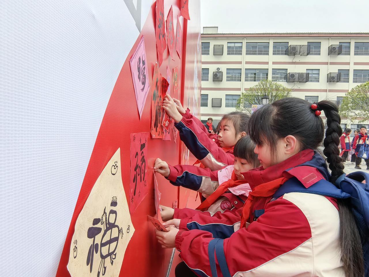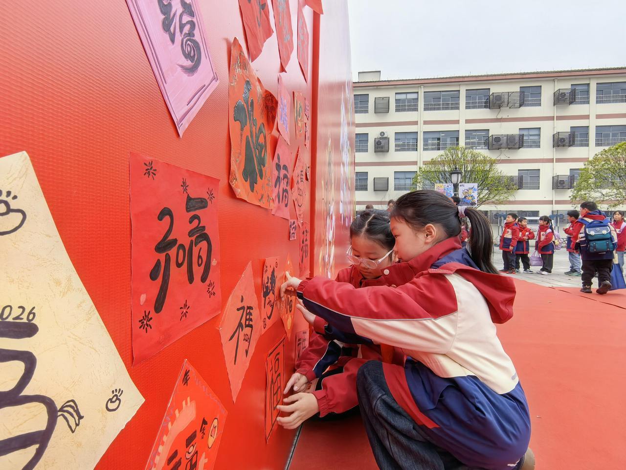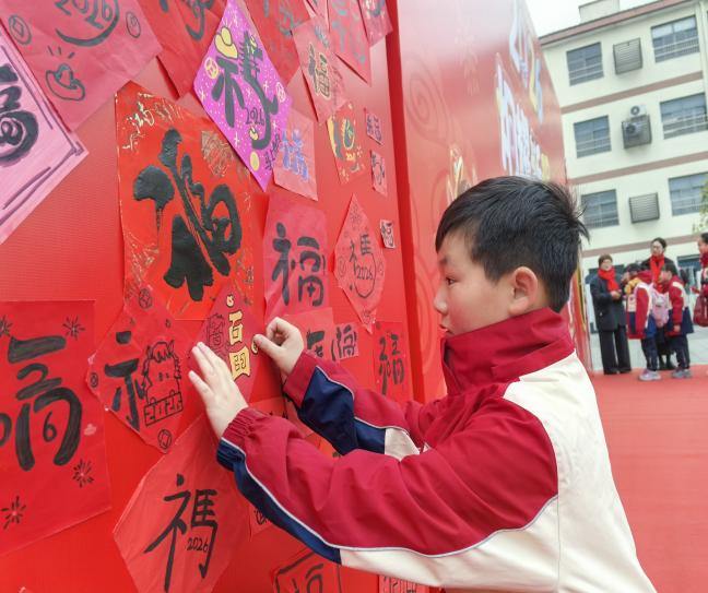 最令人动容的,莫过于“百福纳吉”环节。寒假期间,孩子们就用心练习,亲手书写了一个个形态各异、饱含心意的“福”字。此刻,他们小心翼翼地将自己在家中写就的“福”字拿出来,郑重地贴在校内一面巨大的骏马图案展板上。红纸黑字,翰墨飘香,一个个“福”字如同片片绚丽的马鬃,又似点点盛开的花朵,逐渐汇聚成一匹神采奕奕、蓄势待发的骏马。这匹“福马”不仅融合了孩子们对新一年的美好祈愿,更象征着全体师生团结一心、汇聚力量,共同奔向更加辉煌的明天。看着自己亲手书写的“福”字成为骏马的一部分,孩子们的脸上洋溢着自豪与喜悦的笑容。
