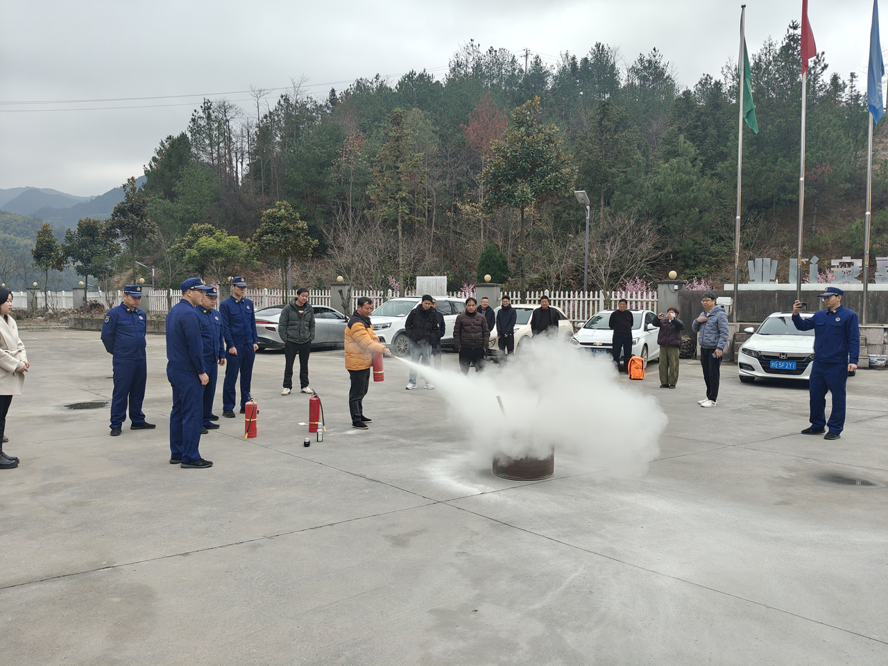 理论培训结束后,全体参训人员在乡专职消防队的指导下开展灭火实操体验。消防队员现场演示了灭火器“一提、二拔、三握、四压”操作要领,并组织参训人员逐一演练。通过沉浸式体验,增强风险防范意识和自救互救能力。
