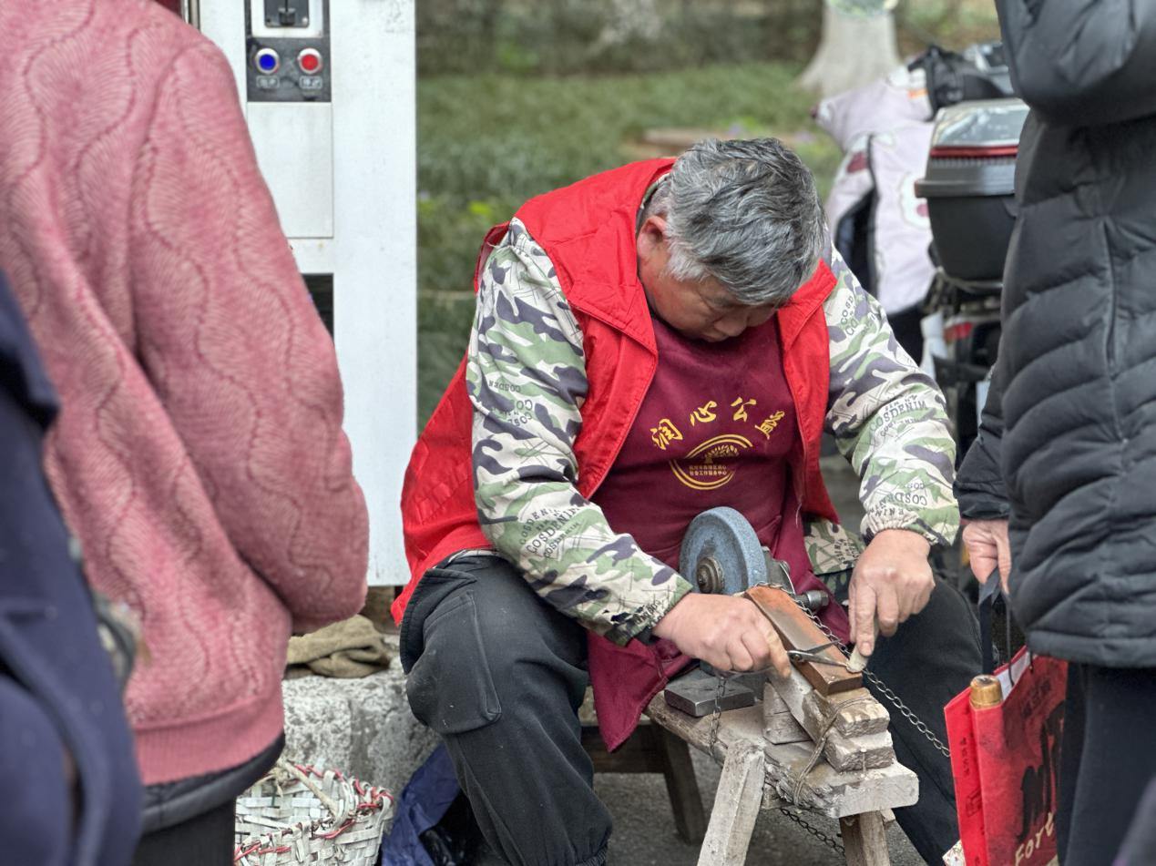 活动现场暖意融融、人气高涨,各类服务摊位有序排开,形成了一道道靓丽的“志愿风景线”。健康服务专区内,志愿者们细致为居民量血压、做听力检测,娴熟开展熏艾灸、理疗服务,同时耐心讲解日常养生知识,筑牢居民健康防线;传统便民专区里,磨刀、修雨伞等“老手艺”服务备受青睐,志愿者们凝神聚力、手艺精湛,让一件件旧物重焕光彩。