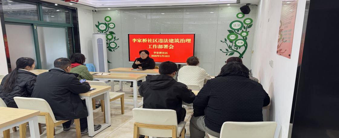 为进一步规范社区建设秩序,消除违法建筑带来的安全隐患,营造整洁、安全、和谐的居住环境,在拱墅区综合行政执法局的指导下,2026年3月18日,李家桥社区组织召开违法建筑治理工作部署会,社区两委成员、辖区物业负责人、党员志愿者代表等10余人参会,共同谋划推进辖区违建排查治理工作。