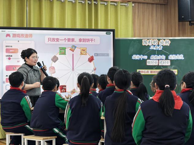 活动伊始,全旺小学刘婷婷老师带来六年级下册《图形的旋转(一)》AI课例展示。刘老师巧妙运用AI工具创设动态教学情境,将抽象的图形旋转转化为直观可视的动画演示,引导学生在互动中理解旋转的要素与规律,生动展现了AI技术对数学思维培养的支撑作用,为在场教师提供了可借鉴的实践范例。