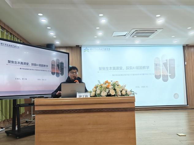 衢州智造新城实验学校教研组长钟丁海老师作《聚焦生本真课堂,探索AI赋能教学》主题分享,从教研组层面阐述了AI背景下的教研规划与实施策略,为各学校教研组推进AI赋能教学提供了系统化的行动框架。