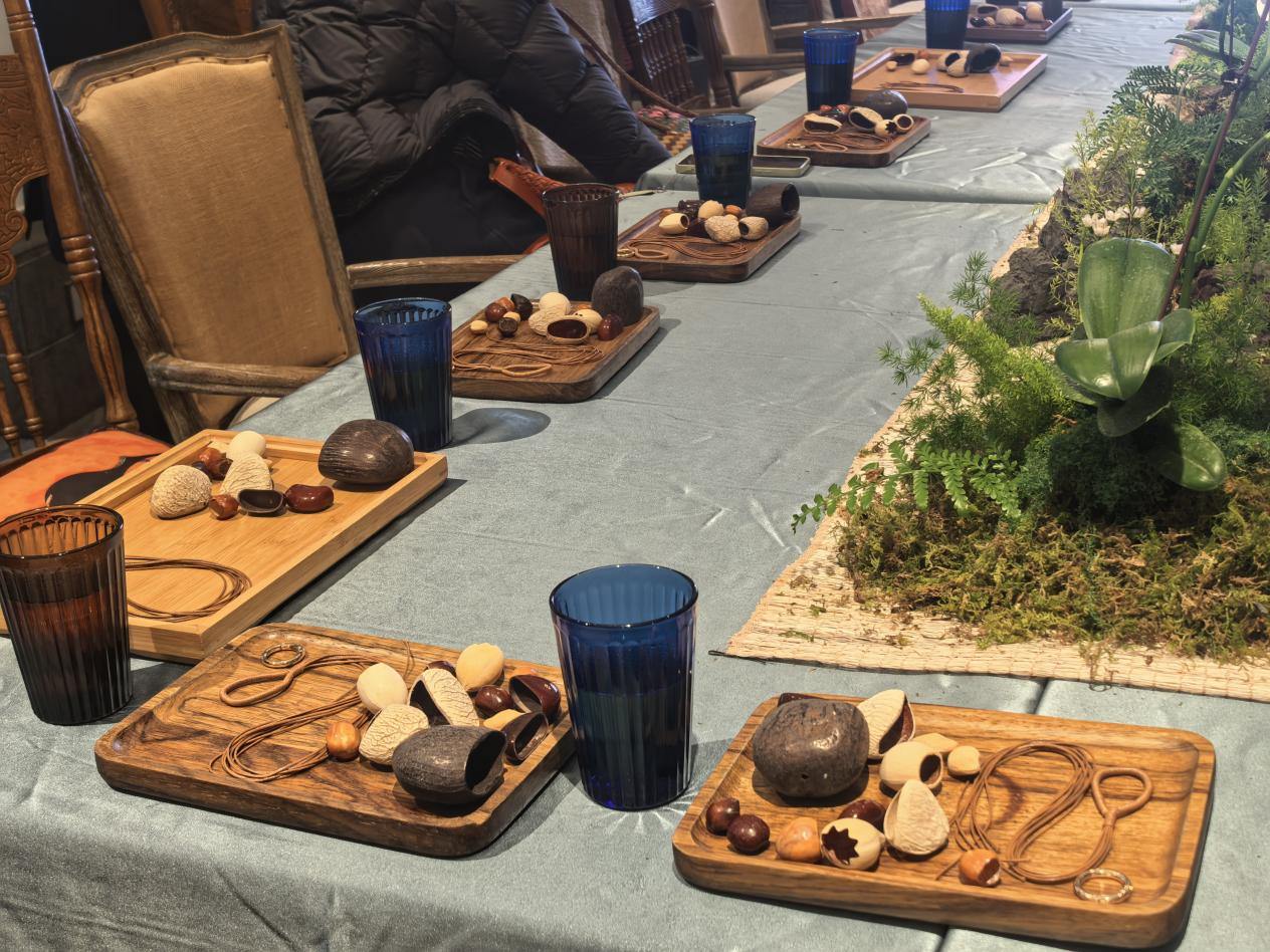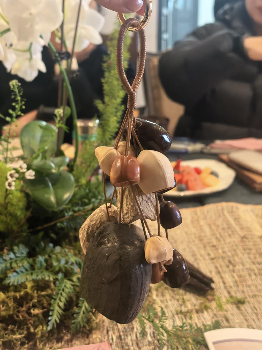 在创作过程中,居民们充分发挥想象将不同颜色与质感的果壳搭配彩色木珠,形成层次丰富的自然风格。有人喜欢简洁排列,有人偏爱点缀其间的小巧思,每一个风铃都呈现出独特的审美趣味。穿绳、钻孔、打结……大家手法娴熟,彼此交流心得,现场欢声笑语不断。