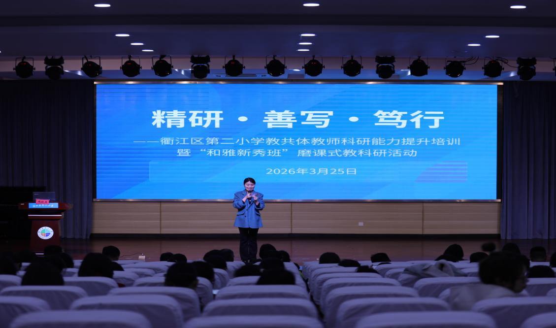 为深化教育教学改革,破解教师在教育教学论文撰写中的困惑与难点,助力教师从经验型向研究型转变,2026年3月25日晚,衢江区第二小学教共体特邀浙江师范大学教育学院周晓燕教授,开展“精研・善写・笃行”教科研能力提升专题培训。衢江区第二小学全体教师及教共体各成员学校教师代表齐聚报告厅,共赴这场教科研成长之约。