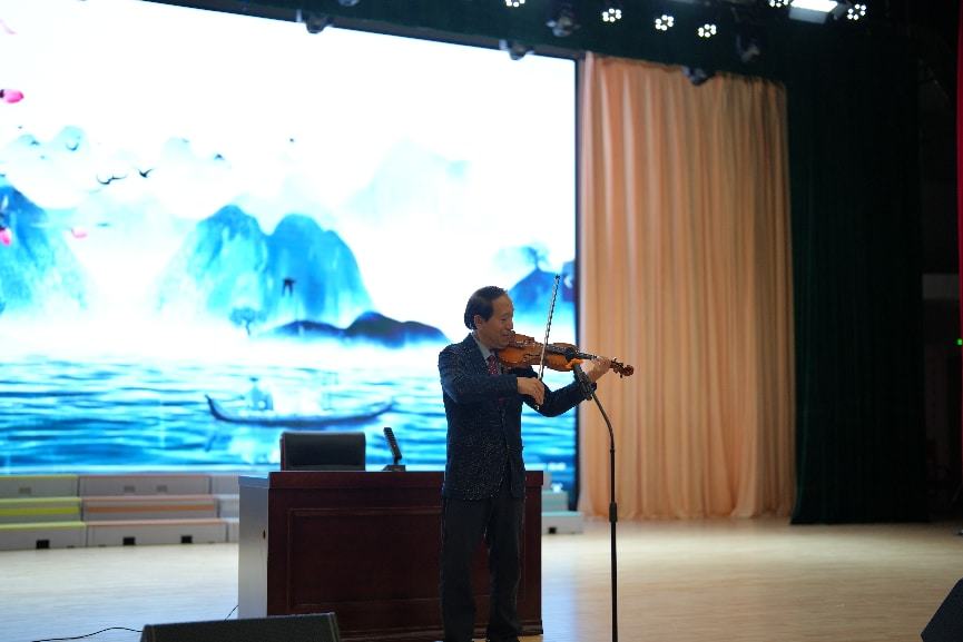 当天,著名音乐家、小提琴家、指挥家、亚洲爱乐乐团团长黄立杰先生,淳安籍知名作家王学武老师,原县委宣传部常务副部长余国富,原县委宣传部副部长、融媒体中心党委书记、主任张志鹏,县教育局总督学邵瑜,校领导班子,全县中小学音乐教师,淳安三中高一年级全体学生和高二艺术类学生齐聚一堂,共同见证这场艺术与成长交融的盛宴。