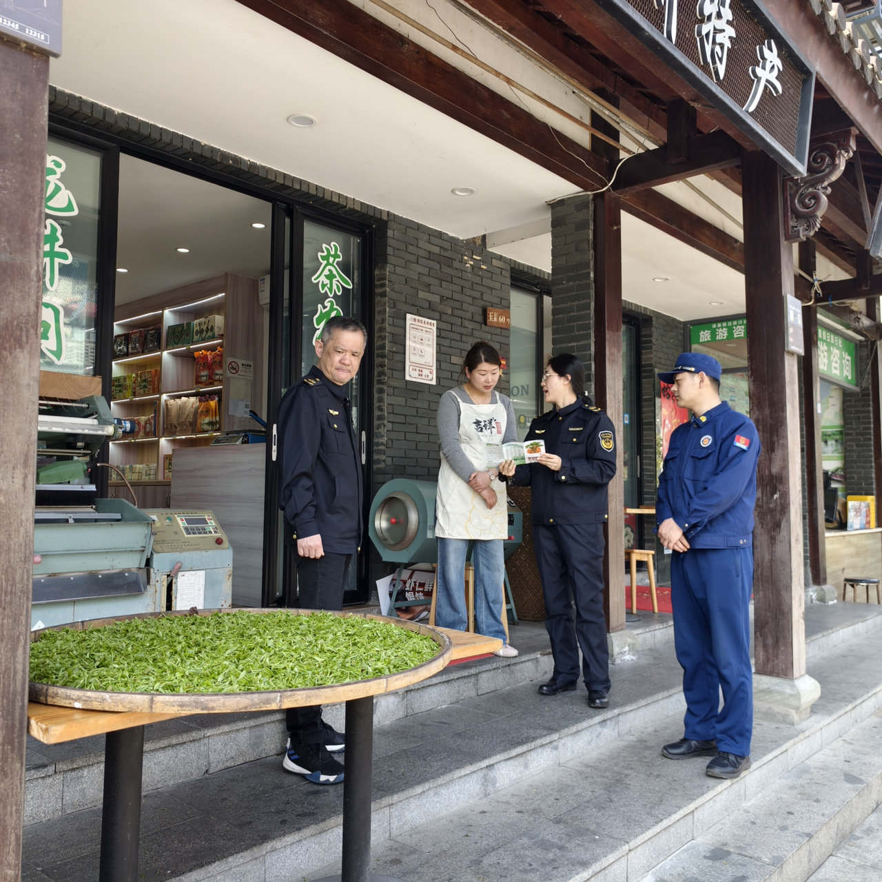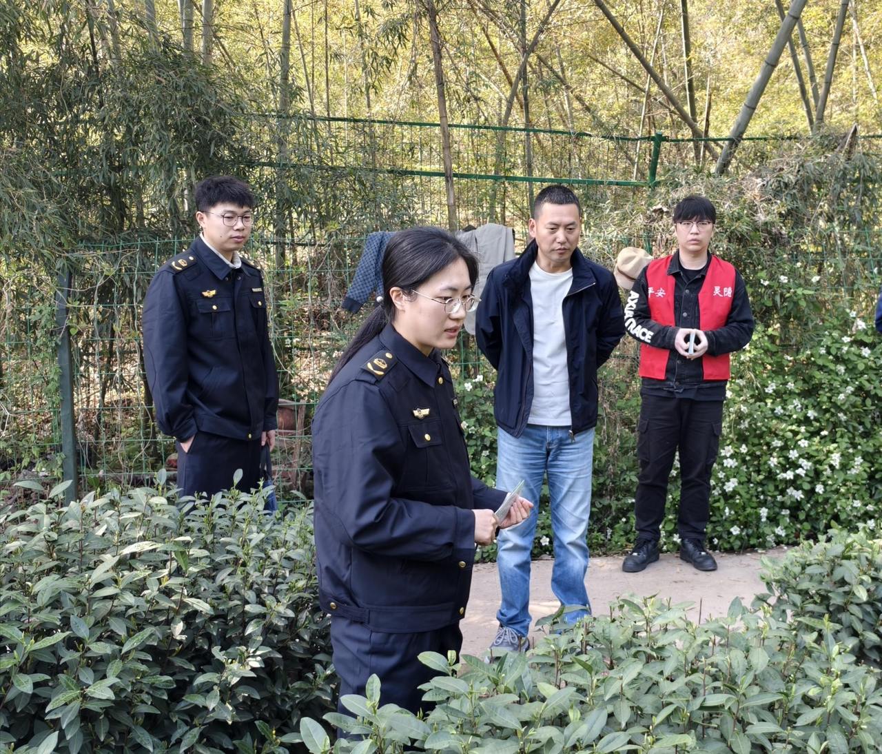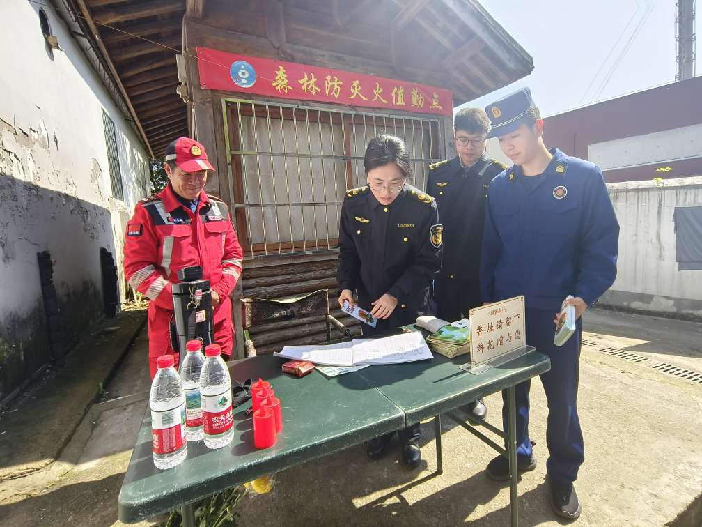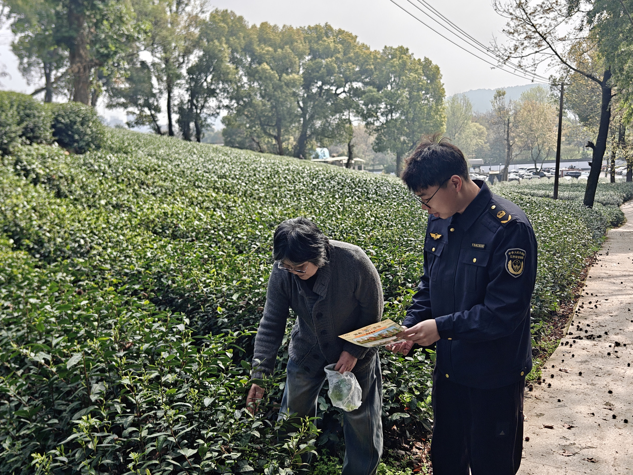 随后一行人沿石虎山游步道实地检查防火横幅、小喇叭宣传等氛围营造情况。山腰茶地里,工作人员向正在采摘的茶农茶工讲解森林消防、野外用火注意事项;遇到徒步游客,顺手递上图文并茂的防火折页,提醒烟头不乱扔。在景区森林防火站点,详细查看了值班记录、灭火器材等相关情况。最后走进青芝坞茶叶店炒茶区,重点排查炒茶机、烘干机等大功率设备,提醒店主规范操作、人离断电。