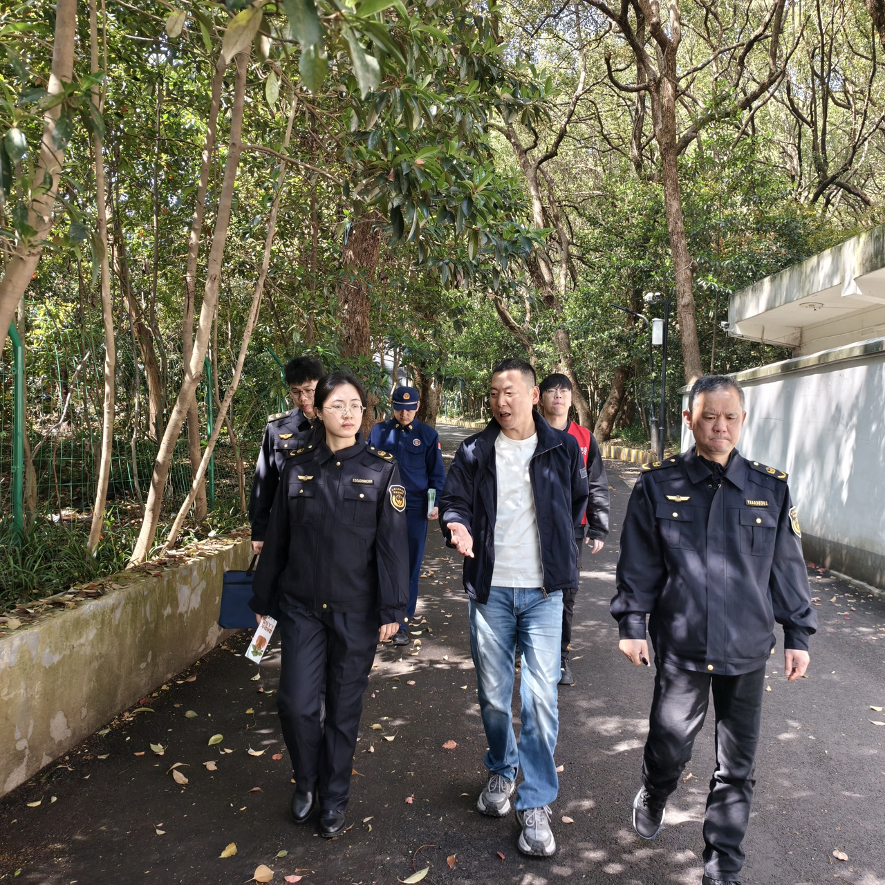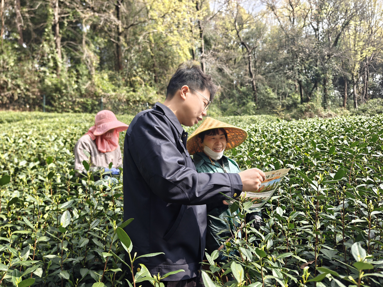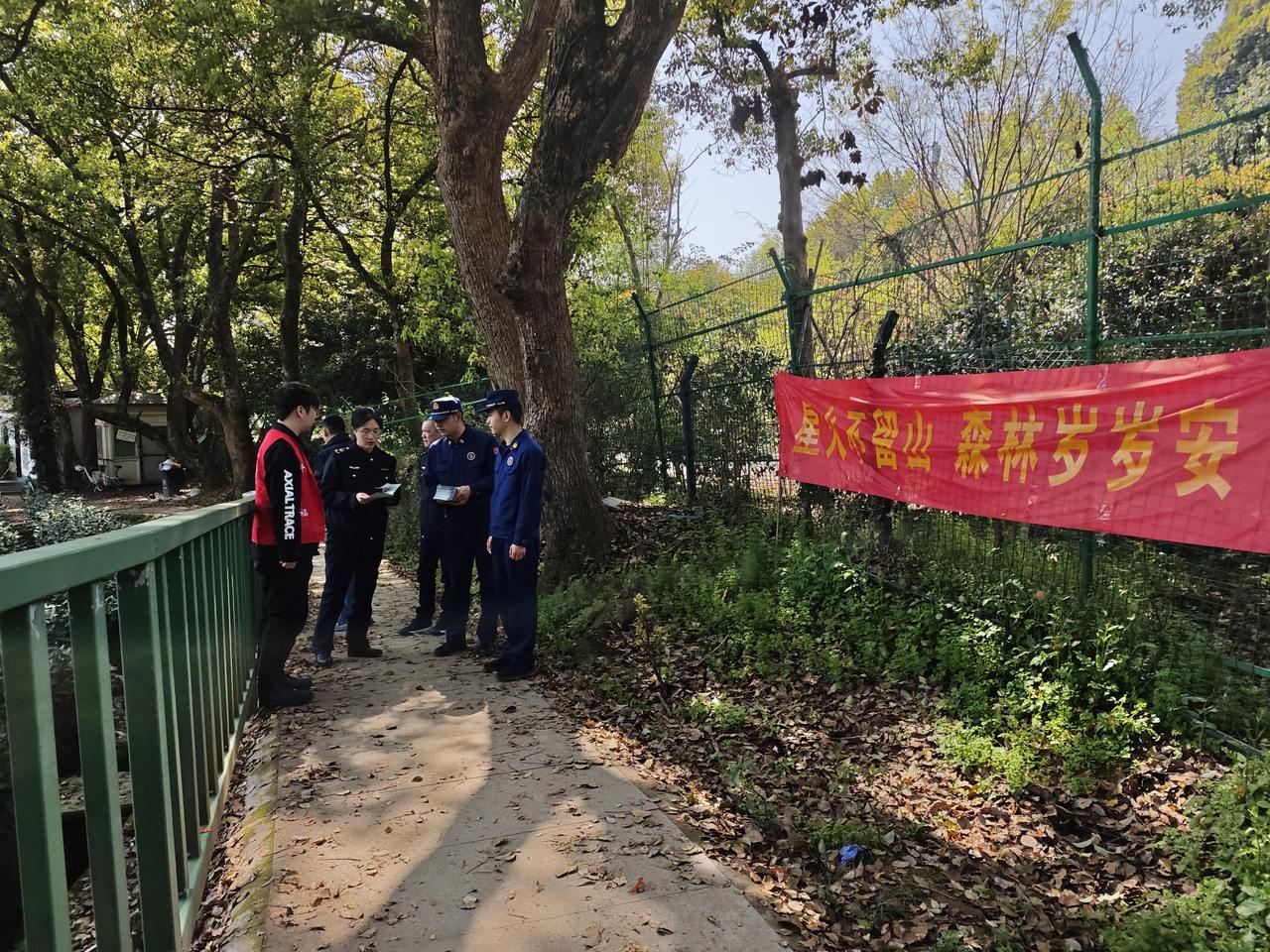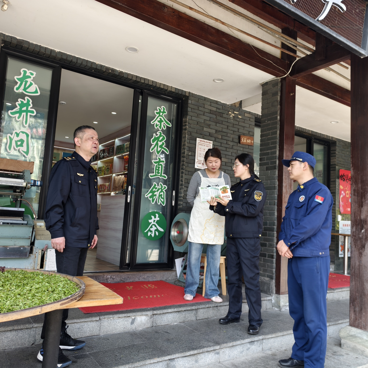 随后一行人沿石虎山游步道实地检查防火横幅、小喇叭宣传等氛围营造情况。山腰茶地里,工作人员向正在采摘的茶农茶工讲解森林消防、野外用火注意事项;遇到徒步游客,顺手递上图文并茂的防火折页,提醒烟头不乱扔。在景区森林防火站点,详细查看了值班记录、灭火器材等相关情况。最后走进青芝坞茶叶店炒茶区,重点排查炒茶机、烘干机等大功率设备,提醒店主规范操作、人离断电。