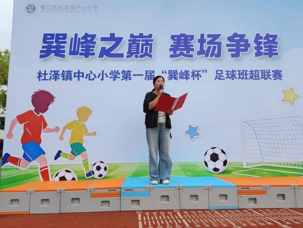 舒素琴校长为开幕式致辞,她寄语全体同学以球健体、以球育德,在绿茵场上发扬团结协作、奋勇拼搏的精神,享受运动、收获成长,并郑重宣布杜泽小学第一届“巽峰杯”班级足球超级联赛正式开幕。随后,校长为本次联赛开球,随着足球划出活力弧线,六年级首场对决正式打响,瞬间点燃全场热情。