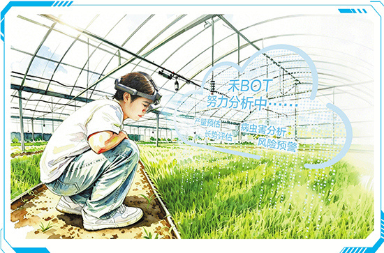 工作人员佩戴AR眼镜观察苗情(AI生成)。 制图:潘泓璇