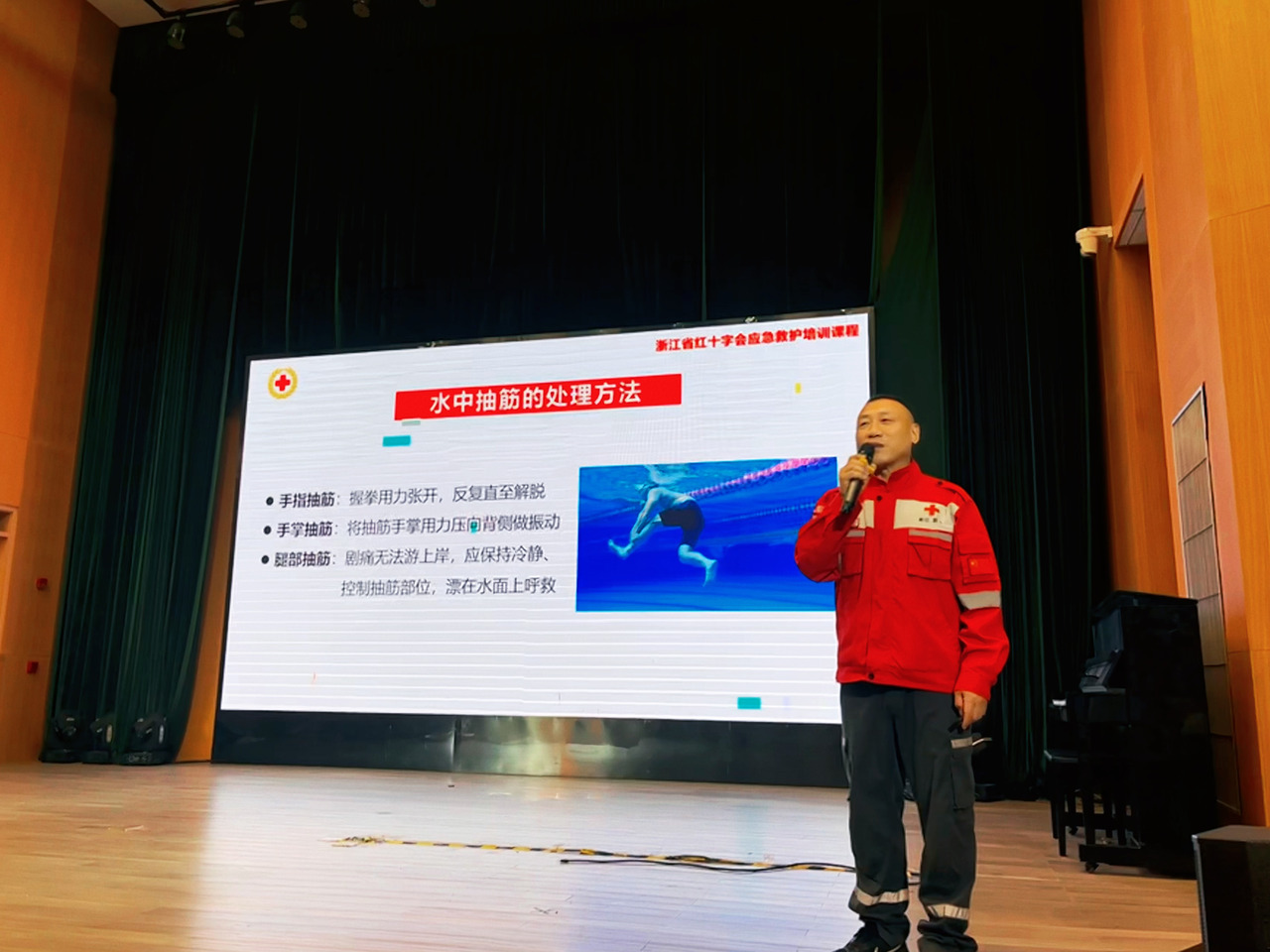 培训伊始,曹建光副校长围绕溺水安全防护核心内容,通过图文并茂的知识讲解、沉浸式情景模拟,深入浅出地普及溺水识别、科学自救及规范施救知识。为破除错误施救误区,让师生直观掌握安全救援要领,曹副校长现场邀请学生上台互动,全程模拟溺水救援实操流程:发现险情第一时间大声呼救、就地取材寻找竹竿、绳索、漂浮物等救援工具、俯身岸边安全施救……每一个步骤都细致讲解、每一个动作都规范示范。参与模拟的学生认真操作、沉着应对,台下师生全神贯注、细心学习,在亲身体验与直观观摩中,清晰掌握溺水救援的正确流程,彻底摒弃盲目施救的错误认知,真正弄懂“安全救、科学救、规范救”的实操要点。