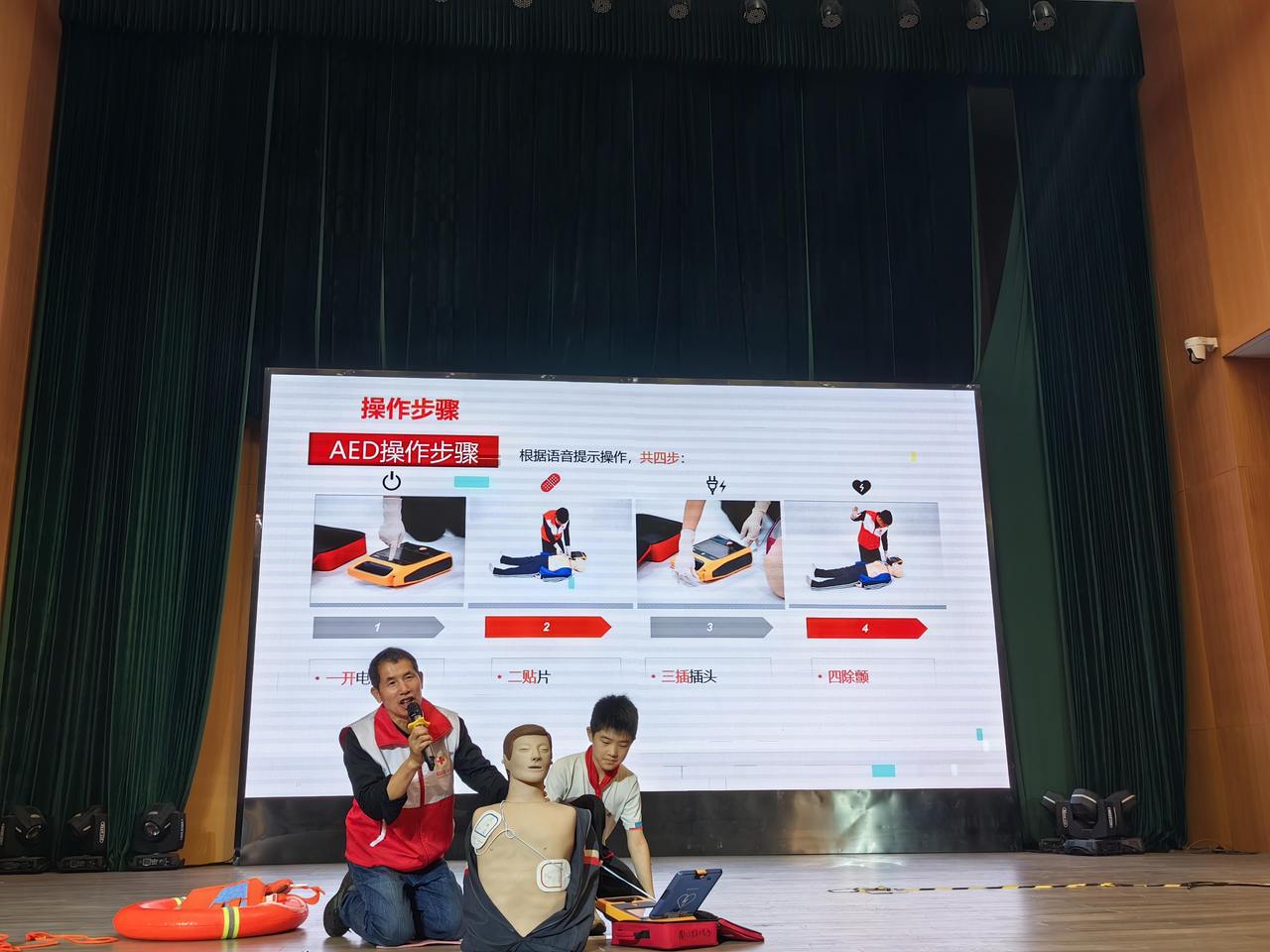 随后,洪礼文老师以红十字运动起源为引,结合校园真实意外伤害案例,聚焦海姆立克急救法、创伤止血包扎、常见意外处置、AED使用四大核心急救技能,展开全面细致的实操教学。课堂上,洪老师手把手指导学生模拟异物梗阻急救,精准纠正背部叩击、腹部冲击的按压位置与发力力度;在AED实操教学环节,带领学生逐一完成开机、粘贴电极片、分析心律、实施电击等规范步骤,让抽象的急救知识转化为可操作、能掌握的实用技能。师生们主动参与、积极互动,在实践演练中夯实急救知识,有效提升了校园突发安全事件应急处置水平。