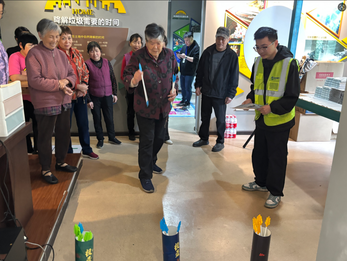 现场最受欢迎的是“垃圾分类飞行棋”。地面铺开大幅棋盘,参与者掷骰子前进,每停一处都要回答对应题目,例如“旧报纸属于哪一类”“过期药品如何处理”等。游戏间你追我赶,居民既回味了童趣,也巩固了分类知识。旁边的“大转盘”前同样排起长队。转盘各格标注不同废弃物名称,指针停下后需说出所属类别,答对即可领取小礼品。有居民感慨:“比起看宣传单,这样动动手、动动脑记得更牢。”“投壶”游戏也被赋予新意——箭矢上分别写着不同垃圾种类,投中对应壶身才算成功。场上叫好声、欢笑声交织,大家在体验传统游戏的同时,加深了对四分类法的印象。
