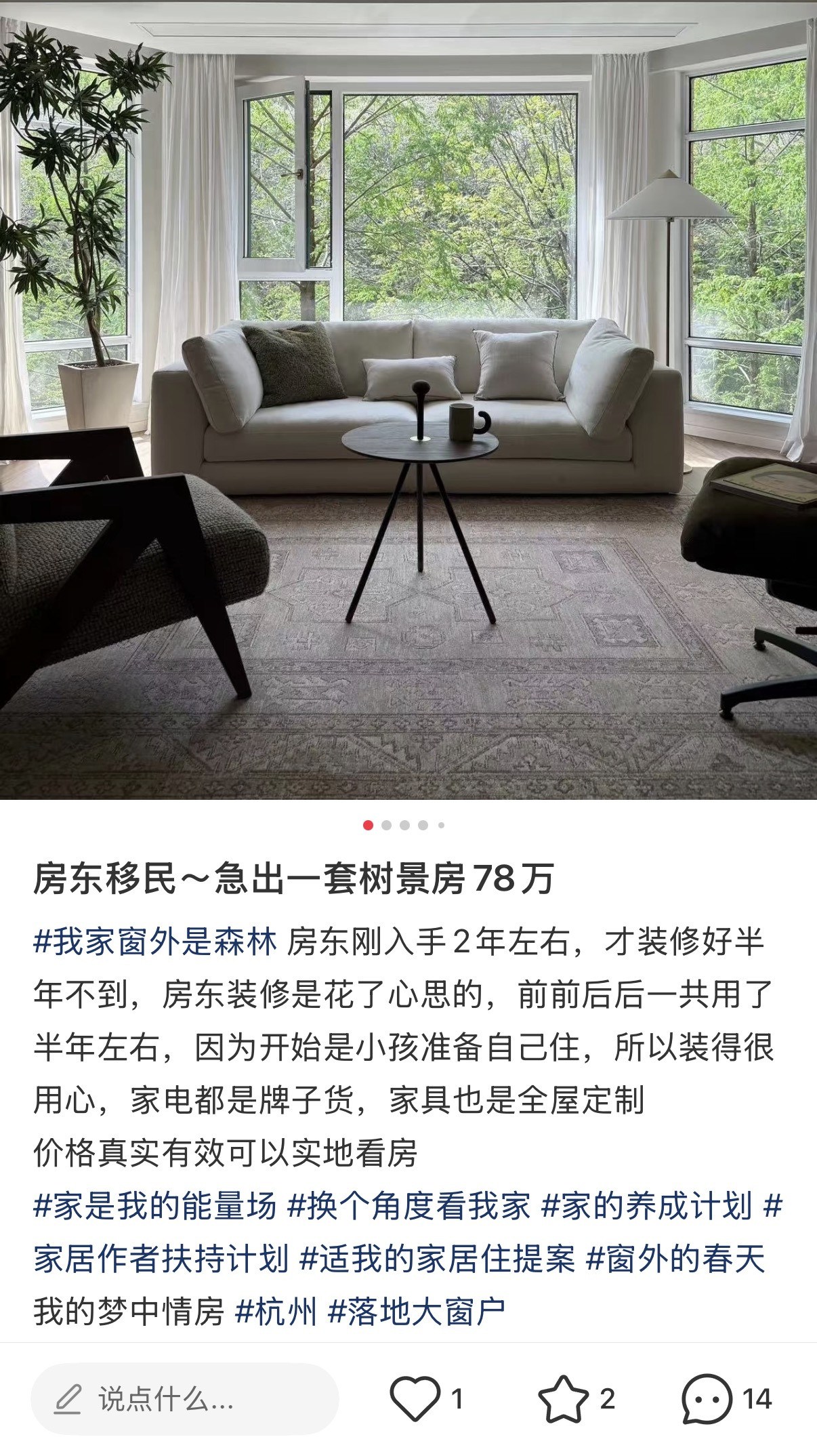 “滨江区父母大理养老,600万入手,现在355万急出”“西湖区夫妻和平分手,财产分割急出”“青山湖旁树景房,房东夫妻准备去买别墅了,80万急出”“老外夫妇要回国,拱墅区350万出不议价”“女儿出国工作了,西湖区317万不议价”“萧山田园小院送菜地,80W有红本”……