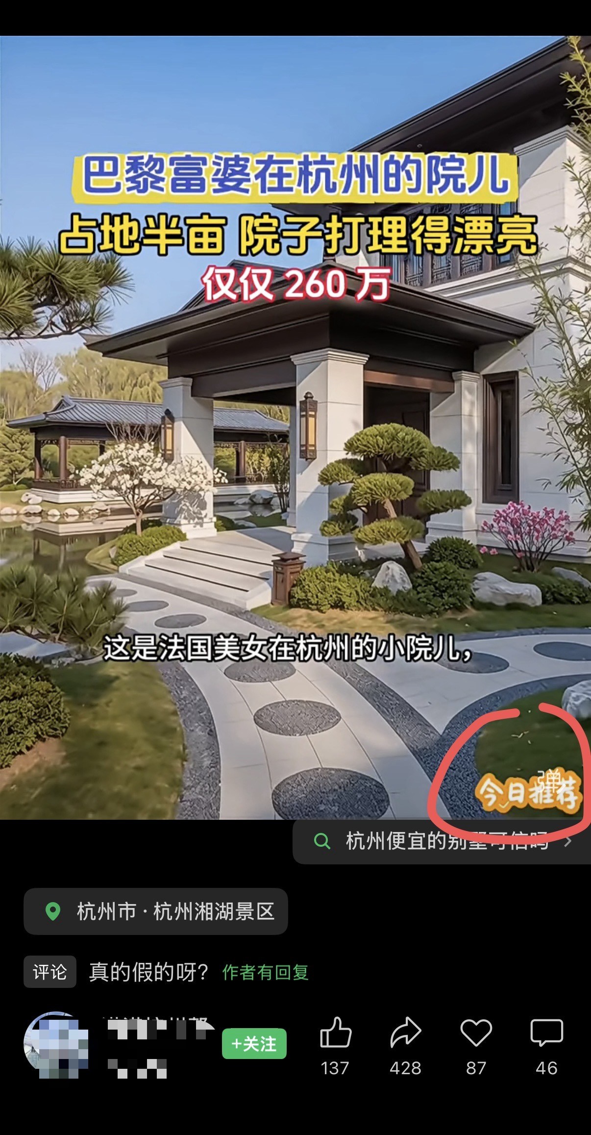 你是否在社交平台上刷到过这类视频,无论价格还是配图都很难不令人心动,其实房源都是假的。一旦你被吸引,点开这条短视频看了一会,平台就会持续向你推送类似的虚假房源视频。
